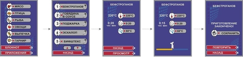 120 встроенных программ позволяют подобрать необходимую. Кроме того, возможна запись до 360 программ собственных рецептов и создание до 4 этапов приготовления в каждой программе, включающих как время непосредственного приготовления, так и этапы ожидания. Персональные рецепты можно хранить в памяти электронного блока, защитив индивидуальным паролем повара.